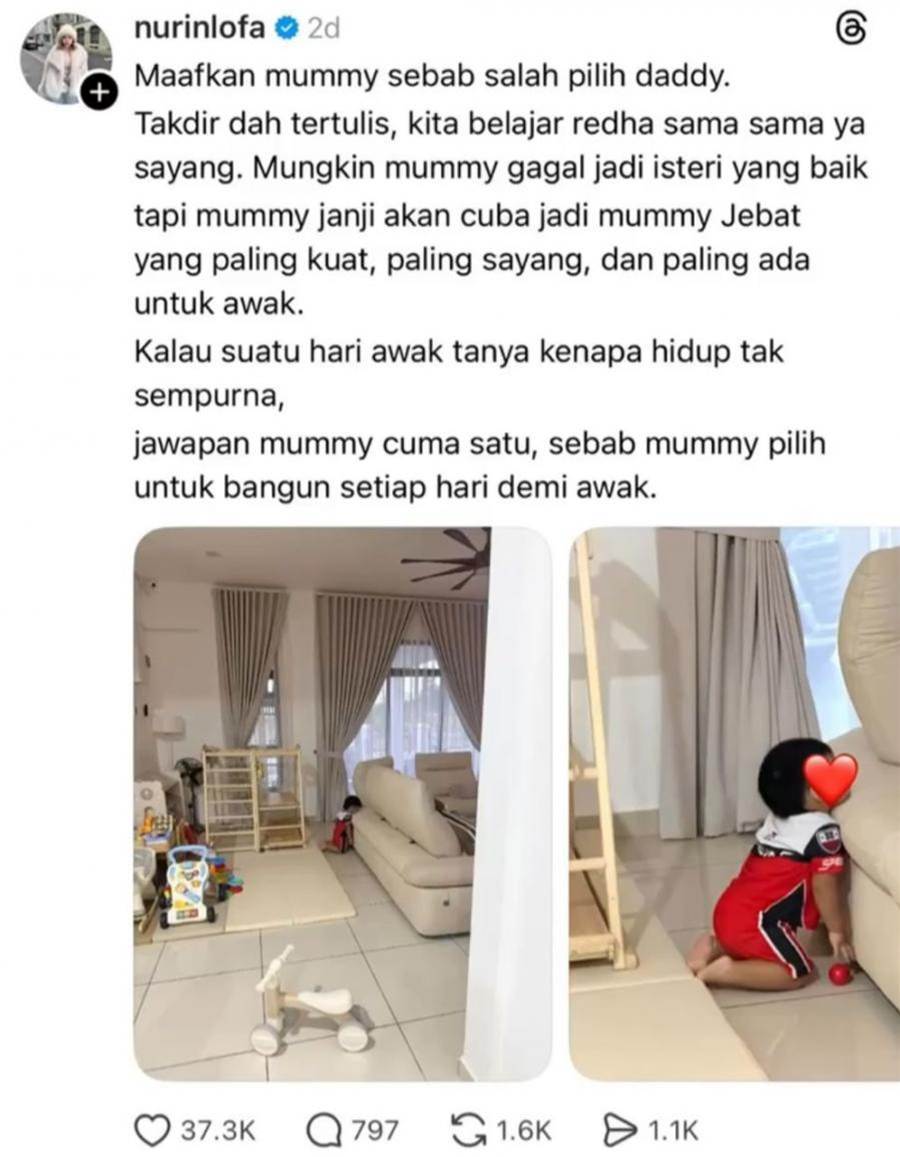 在另一则贴文中,Nurin 分享了儿子的照片,并配上令人心疼的文字:“原谅妈妈替你选错了父亲。也许我不是一个好妻子,但我会成为最坚强、最爱你的妈妈”。据最新报道,Nurin 表示,她将于 2 月 25 日在上法庭与丈夫处理此案。