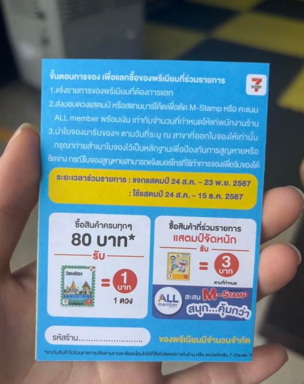 在接下来的几个月里,凡是到泰国7-Eleven购买商品的顾客,如果每次消费超过80泰铢,就会得到一张价值1泰铢的邮票。