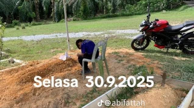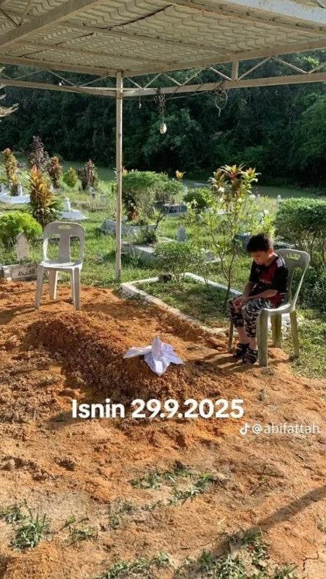 死者的爸爸Khairol Rizal Mustafar将相关照片分享到社交媒体上,从照片能看到Qarnain就这样安静地坐在墓旁,默默悼念已经离开的好友。