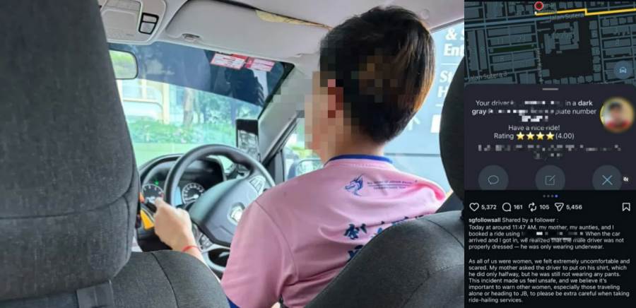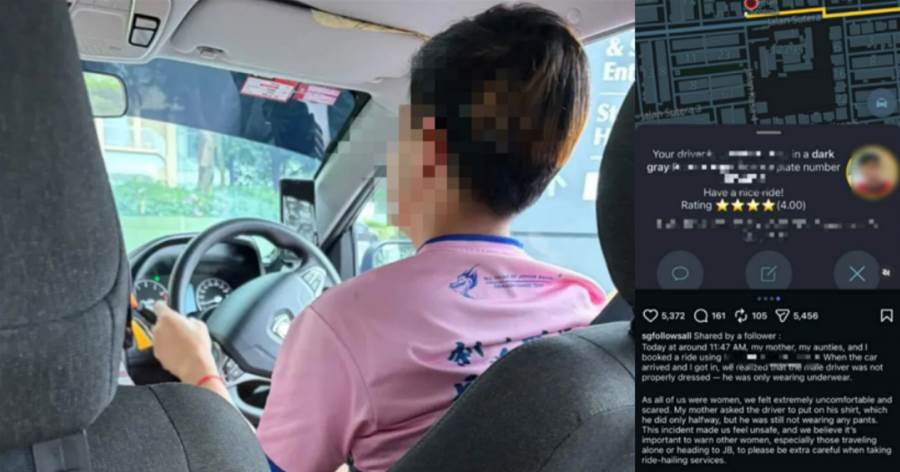根据社交媒体Instagram用户sgfollowsall分享读者投稿,指上述事件发生在本月28日早上11时47分许,一名女子与母亲、阿姨在新山使用电召车应用程式叫车,上车后惊讶发现华裔男司机仅穿着一件内裤载客。
