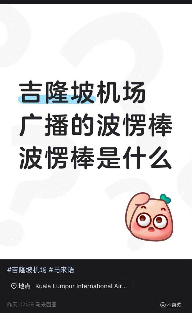 日前,有一位中国游客在小红书发布了一则以“吉隆坡机场广播的波愣棒波愣棒是什么意思”的帖子引发网友热议。