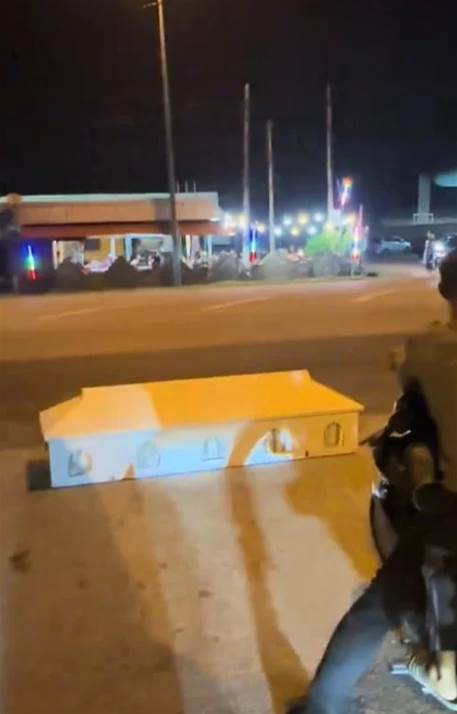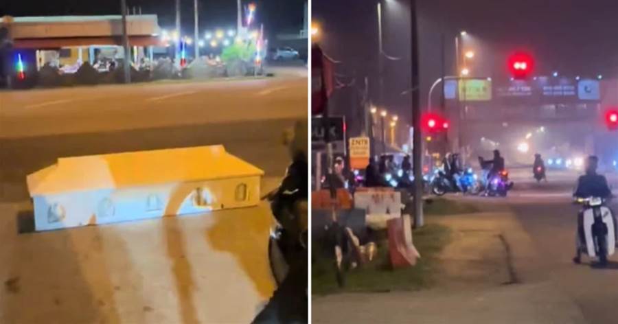 男子直接将灵柩放在路边,试图震慑飙车族。