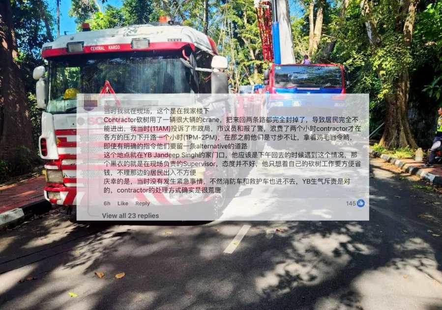 峇都丁宜居民透露,事发时工程用大型吊车封锁唯一进出道路数小时,虽要求预留替代路线,但承包商态度强硬。一名居民称:“佳日星回家遇封路,现场负责人不顾安危,生气是应该的。”另有居民质疑,封路理由是两个月前倒向荒楼的树木,却让行人穿越危险区域。不过也有网民为承包商发声,指工程机械按小时计费,拖延一小时损失上万,且道路狭窄、树木危险,施工本就困难,双方都是“制度受害者”。