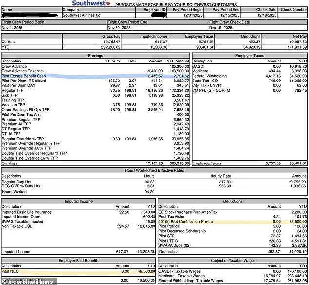 根据外媒《每日邮报》报道,一名机师Corbin Williams在社交平台X上,分享了机师薪资单,当中显示该机师是服务于美国西南航空(Southwest Airlines)。