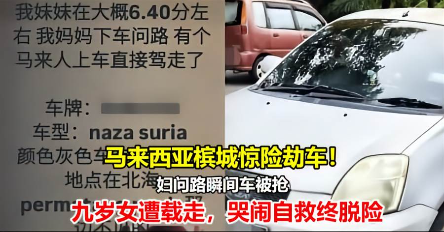马来西亚槟城州发生惊险劫车案,一名妇女下车问路时,竟被不明男子趁机抢走汽车,连车内的九岁女儿也一并被载走,女童一路哭闹,男子最终将她弃置路旁后驾车逃。