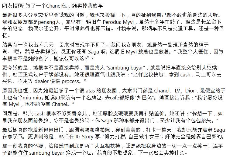 不过,女友卖了Myvi后的钱也根本不够买包包,于是厚着脸皮要求男子帮她补贴差价。最后,女友带着新包包出门,跟闺蜜喝咖啡拍照,而男子只能开着老Saga在家里叹气。