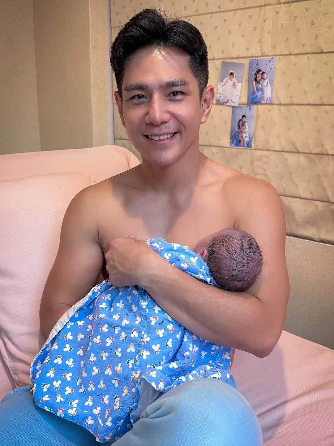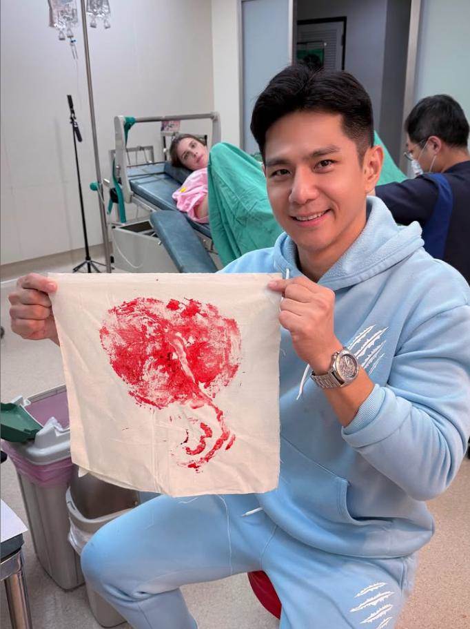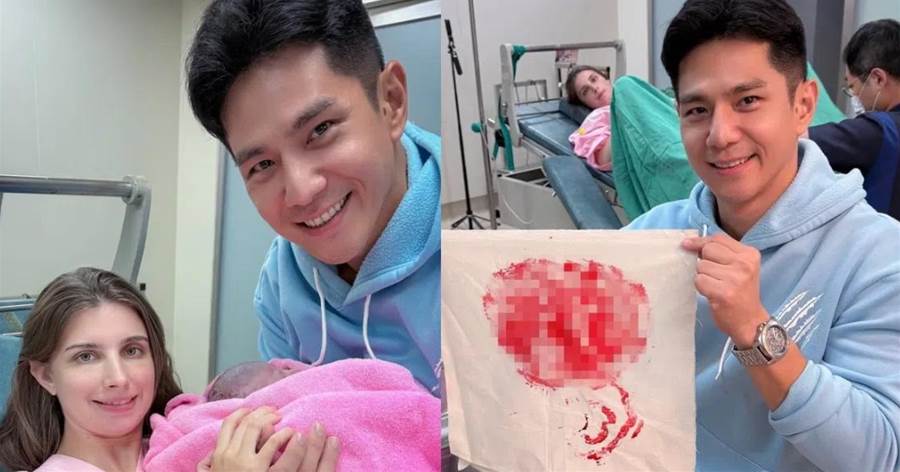 祖雄更晒出自己拿着老婆产后血红的胎盘拓印图片,和自己裸上半身抱儿子的帅照,网民赞他是最帅奶爸,笑说“差点以为(他)要亲自喂奶”。