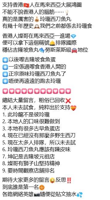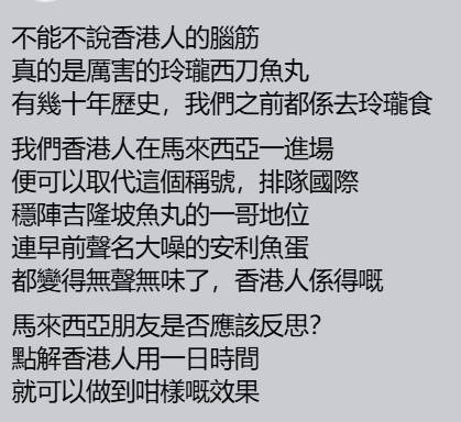 据了解,该 YouTuber 在最初版本的帖文中,写道,“不能不说香港人的脑筋真的是厉害的,玲珑西刀鱼丸有几十年历史,我们之前都是去玲珑吃,我们香港人在马来西亚一进场便可以取代这个称号,排队国际,稳占吉隆坡鱼丸的一哥地位,连早前声名大噪的安利鱼蛋都变得无声无味了,香港人是行的。”