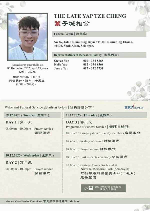 另外,根据讣告显示,叶子诚于昨日与世长辞,家属为他设灵3天后,于本月11日举殡,并安葬在富贵山庄位于士毛月的风景墓园。