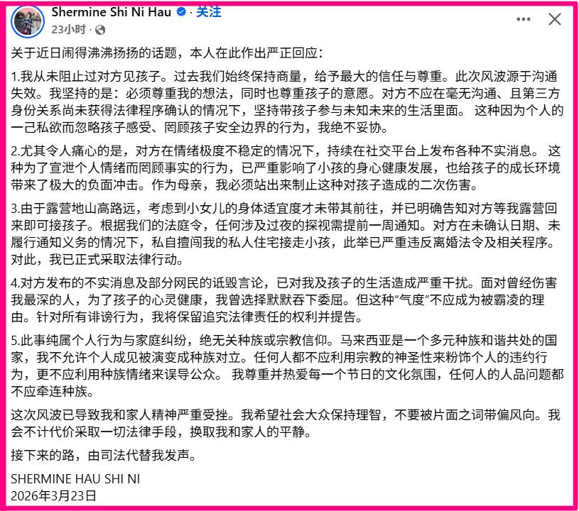 Shermine 表示,这次风波让其与家人精神严重受挫,将选择用法律手段换取和家人的平静、由司法代替发声,她也希望大众不要被片面之词带偏风向。