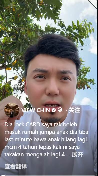 View Chin 也以马来语在影片中说,此举让他想起 4 年前类似情况,当时前妻同样带走孩子,不让他见面。