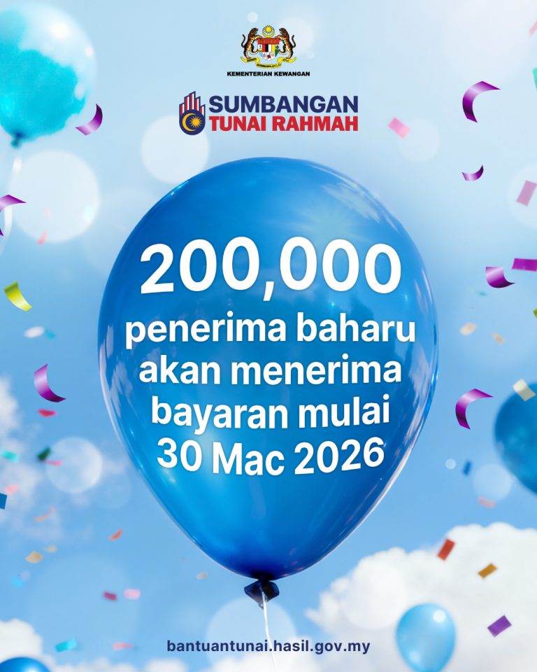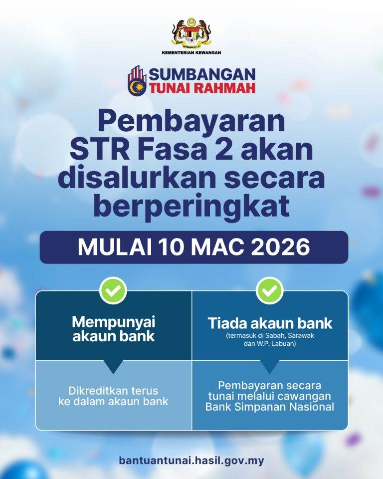 根据大马财政部(Kementerian Kewangan)发出的文告,2026 年的第二阶段 STR 援助金会从 3 月 10 日开始发放。至于今年 1 月才刚获批准的新申请或上诉成功者(20 万人),则会在 3 月 30 日开始才开始领取款项。