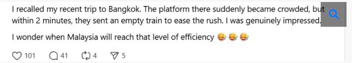 这名女子还接着感叹,外国的效率之高与本地形成鲜明对比:“我想起当时去曼谷的旅程时,那里的站台突然变得拥挤起来,但不到2分钟时间,相关单位就调派了一列空车来纾解人潮,让我佩服不已。”