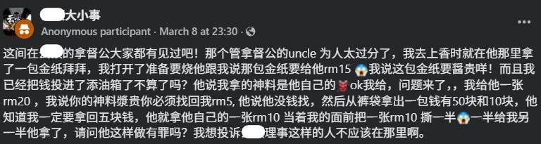 根据《星洲日报》报道指,这名本地游客遇到卖香烛的庙祝,该庙祝不仅向香客私收RM15的香油钱,甚至在没有RM5找零的时候,把RM10撕一半,当RM5退给香客,让香客非常生气,上网揭发该名“庙霸”不仅敛财,还涉嫌毁坏钞票。