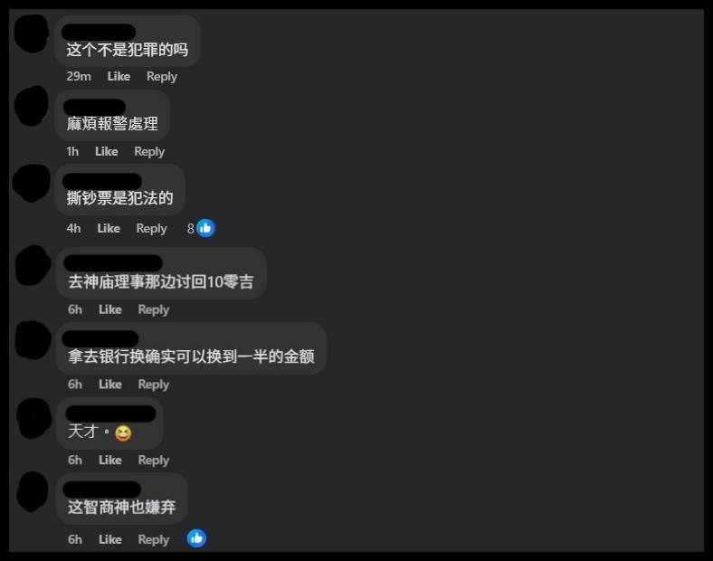 不少网民纷纷留言表示,“这根本勒索啊”、“快快报警处理,看庙祝之后会不会如此蛮横”、“一时之气,会惹祸上身”、“走火入魔的最高境界”、“这个不是犯罪的吗”、“麻烦报警处理”、“撕钞票是犯法的”。