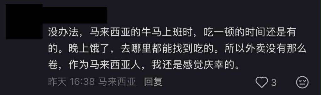 “没办法,马来西亚的牛马上班时,吃一段的时间还是有的。晚上饿了,去哪里都能找到吃的。所以外卖没有那么卷,作为马来西亚人,我还是感觉庆幸的。”