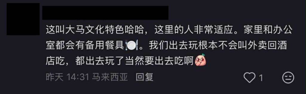 “这叫大马文化特色,这里的人非常适应。家里和办公室都会有备用餐具。我们出去玩根本不会叫外卖回酒店吃,都出去玩了,当然要出去吃啊。”