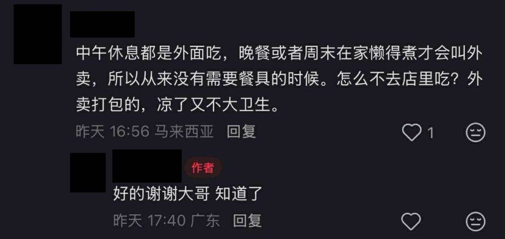 “中午休息都是外面吃,晚餐或者周末在家懒得煮才会叫外卖,所以从来没有需要餐具的时候。”