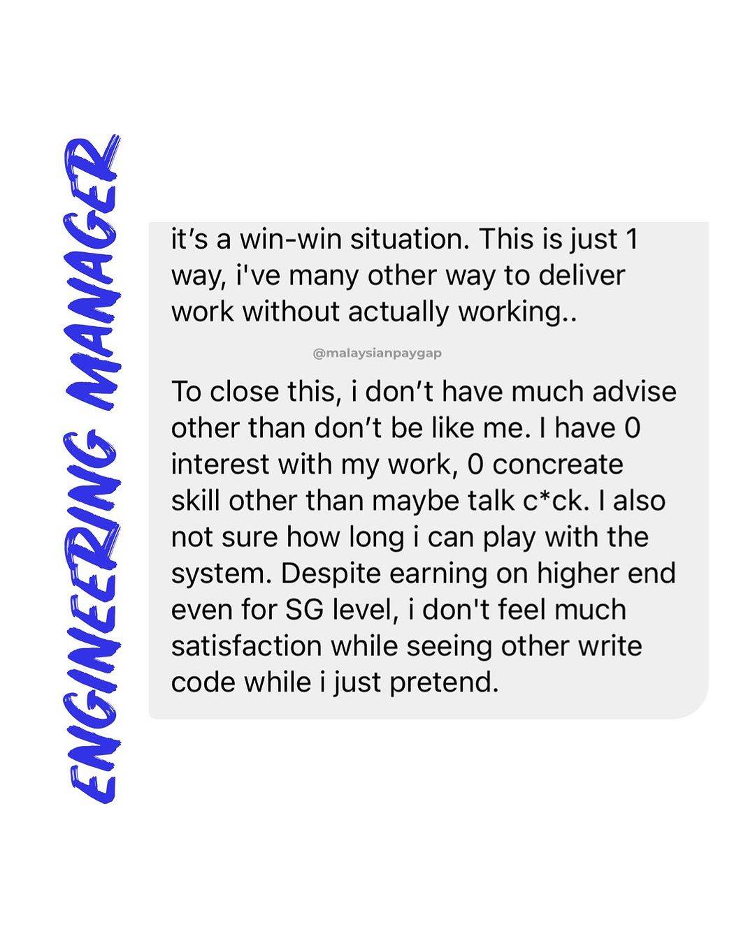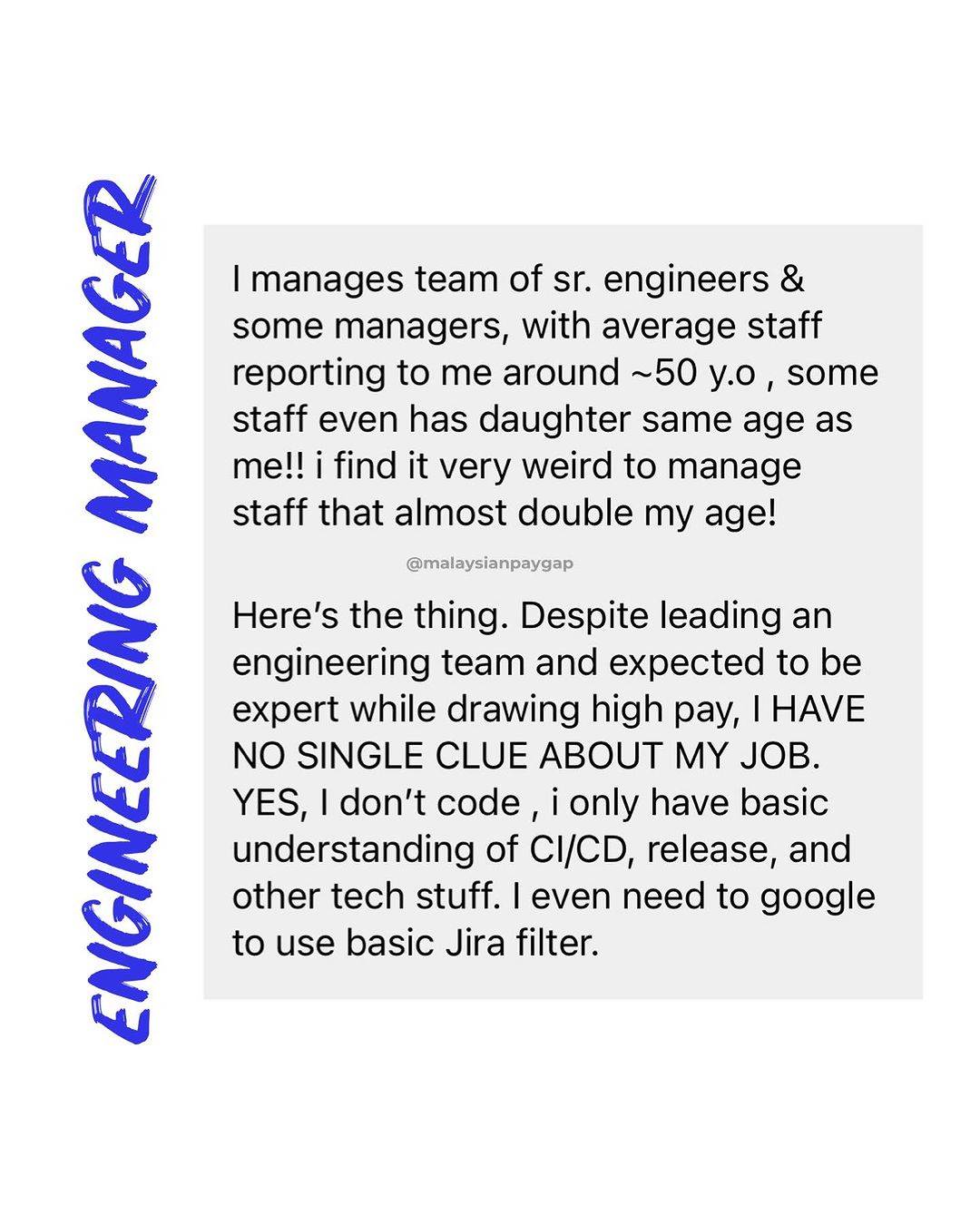 根据这名男子分享的贴文,他透露自己目前在新加坡担任工程经理,需要管理一个高级工程师的团队,而团队的成员大部分都比自己年长,平均年龄50岁。