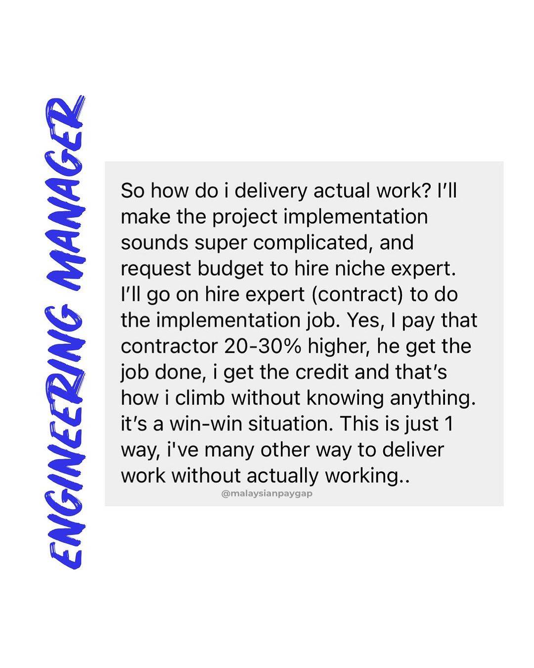 虽然对于工作什么都不懂,但男子透露能完成手头上的项目的秘诀就是要让项目的执行过程听起来很复杂,以便能获取更高的预算。另外,男子还聘请了外面的专家来执行工作,并支付他们20%至30%更高的费用,完成项目后男子再去邀功。