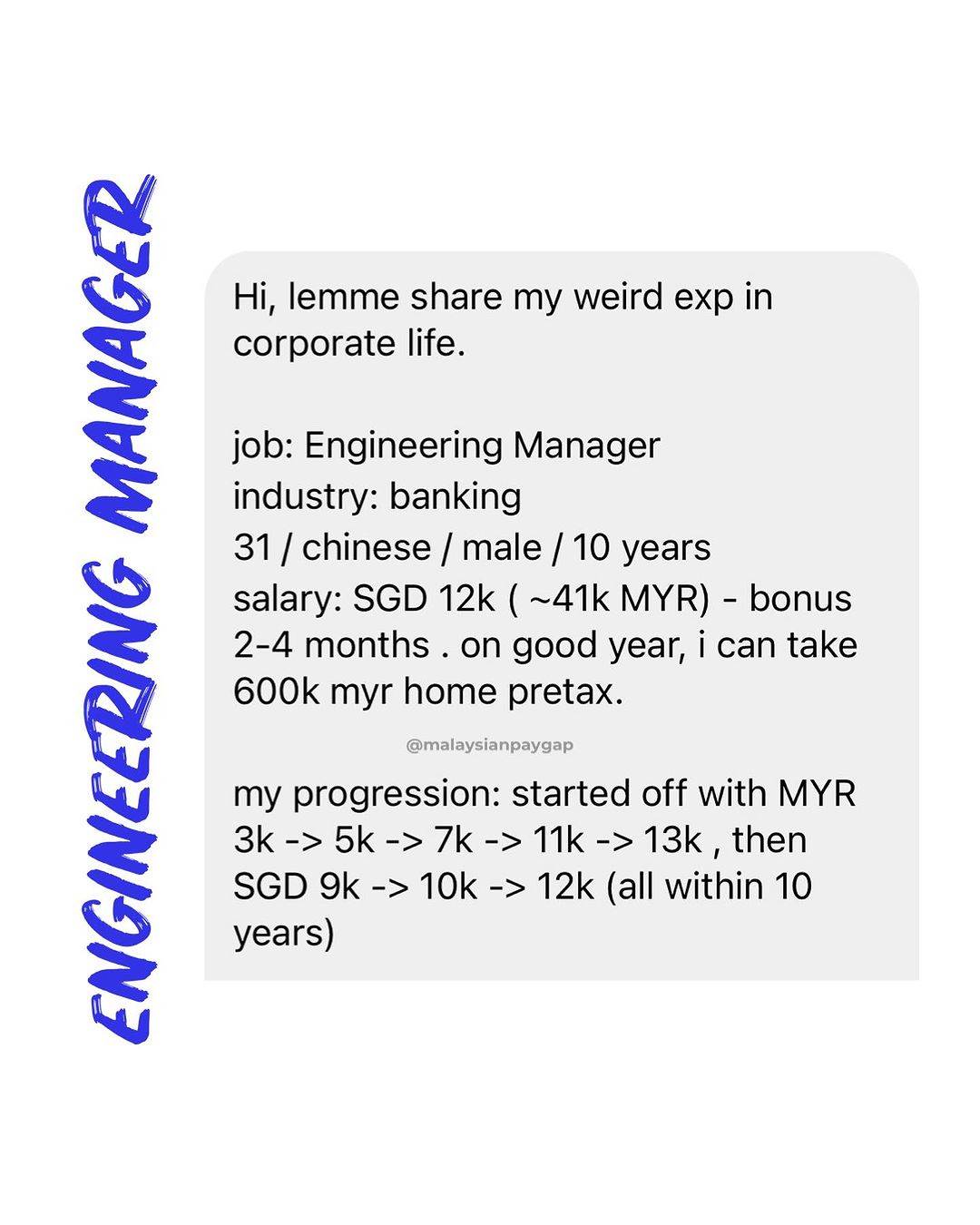 一名大马男子早前在本地职业薪酬资讯专页Malaysian Pay Gap分享自己工作的这10年,从刚毕业的RM3,000月薪,到如今在新加坡月入高达RM41,000(12,000新币)的小秘诀,引起网民热议。