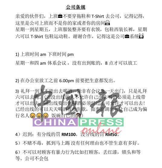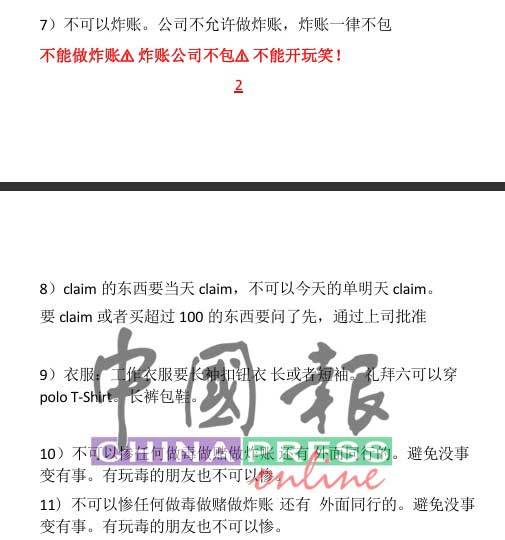 林汉成今日在MHO总秘书希山慕丁的陪同下召开记者会,展示有关手机的内容。只见该阿窿的手机里,有一份多达69页的工作守则,当中提到“不能参与赌博”、“不能吸毒”、“不准结交涉赌毒的同行或朋友”。
