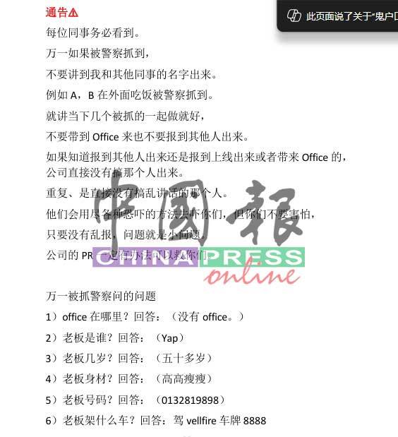另外,这些问题里也提到,万一被警方抓到,千万不能供出同事的名字,更不要将警方带到办公室内,并担保照着答案回答,就一定不会有事,“若被发现供出同事身分,后果自行负责!”