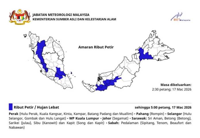 根据当局在下午发布的预测,这场恶劣天气预计将持续至今日(17日)下午5时。半岛北部的霹雳州多地首当其冲,涉及范围包括上霹雳、江沙、近打、金宝、马登巴登及慕亚林。