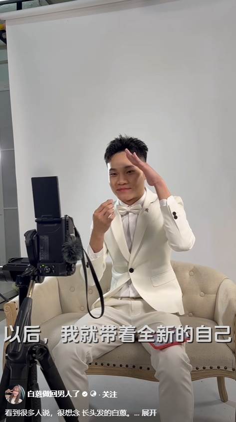 近日,白蒽毫无预警在各大社交平台宣布决定“做回男人”,甚至将账号名改为“白蒽做回男人了”。稍早,他发布了一支亲自剪发、卸妆,最后换上男装的照片。