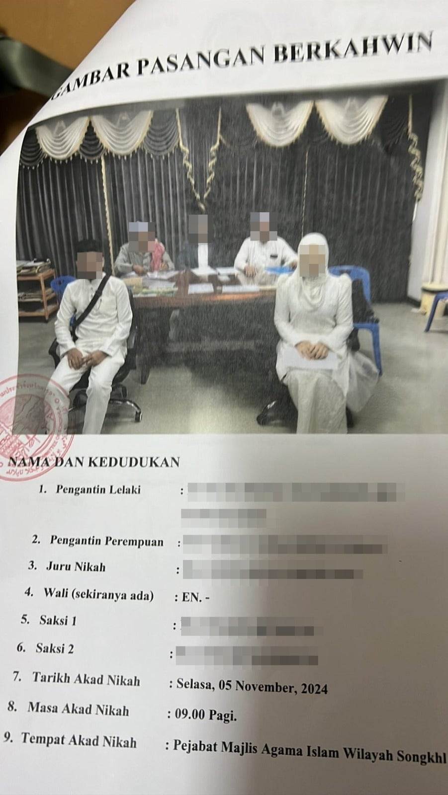 她透露,这名男子也称,他和嫂子已经结婚1年,两人是于2024年11月5日,在泰国Songkhla的宗教局注册结婚。