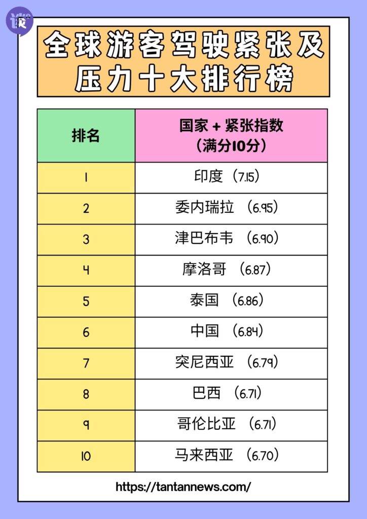 在这项调查,印度以平均“紧张指数”7.15分,被评为全球游客最不安于驾驶的国家,依序是委内瑞拉(Venezuela)、津巴布韦(Zimbabwe)、摩洛哥(Morocco)。亚洲国家方面,泰国名列第5,中国居第6。