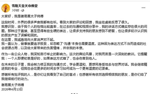 谢振兴在声明中指出,近期的风波让他进行了深刻反思,也意识到由于个人性格较为直率,在过往的沟通及视频分享中,表达方式确实存在不足之处。