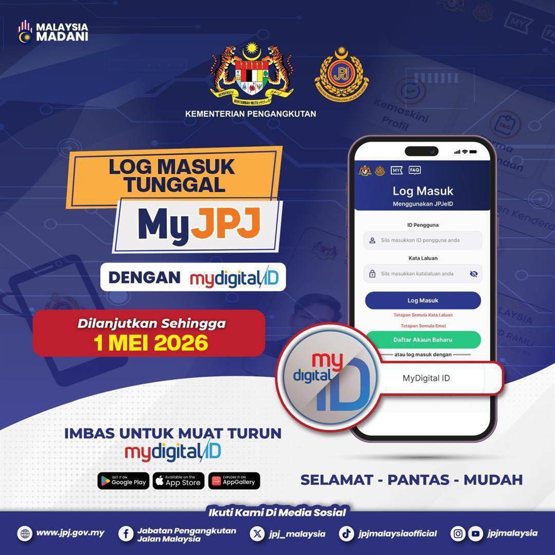 根据陆路交通局在官方社媒发出最新消息,从 5 月 1 日起,登入 “MyJPJ” 手机应用程式,只能使用国家数字身分(MyDigital ID),且是唯一的方法。