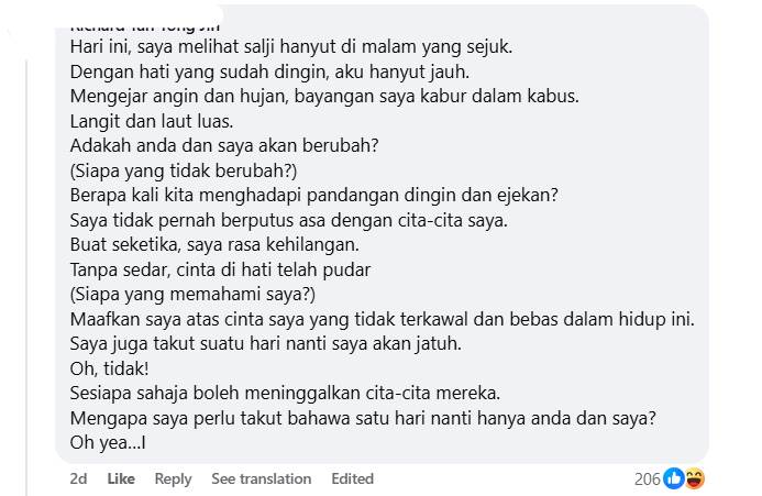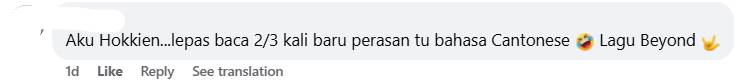 后来,有网民成功破译Mohd Firdaus Yaacob的贴文内容,原来是出自于香港摇滚乐团Beyond名曲《海阔天空》的歌词。另外,也有热心的网友将歌词翻译成马来文版本,让不明白粤语的巫裔网友了解这首歌的意思。