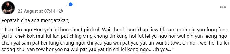 一名大马男子日前通过社交媒体分享一段“中文谚语”,但不少网民看了都一头雾水,因为他分享的这段看起来完全就像是一串乱码,一眼看出完全看不明白。后来经过网友破译后,才发现原来他分享的是香港摇滚乐团Beyond名曲《海阔天空》的歌词!