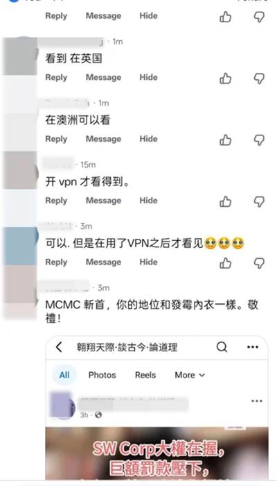 他坦言,如今他仍有专页的使用权限,而身在国外的网友还能如常浏览,惟身在大马的网友及他的粉丝无法观看他的专页,有者还需“翻墙”,即使用虚拟专用网络(VPN)才能浏览。