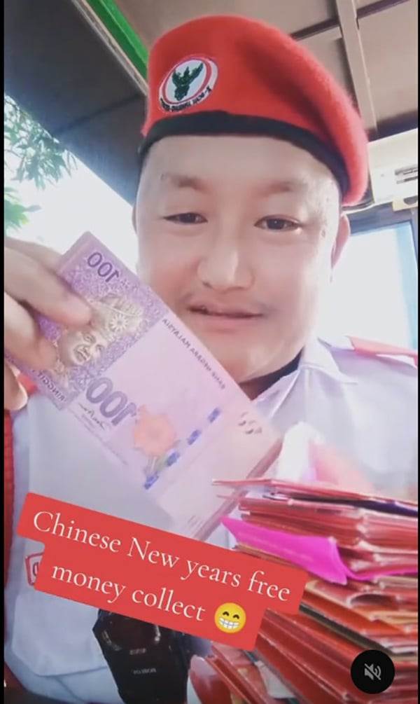 根据网民近日在社交媒体分享的视频,一名公寓保安员在桌子上,展示他所获的一整叠红包封,接着开心地逐一拆红包,映入眼前的是装有5令吉、20令吉甚至高达100令吉钞票的红包。