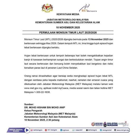 大马气象局正式发布预警,我国将于本月13日起全面进入2024/2025东北季风期,这一气候周期预计持续至明年3月。