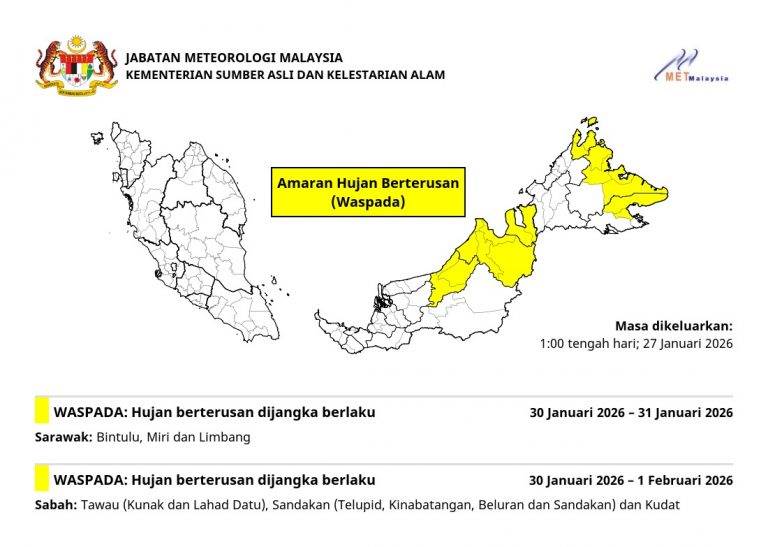 这些州属要小心!大马气象局(Malaysian Meteorological Department)发出持续降雨警告!