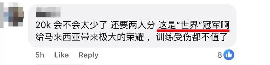 据悉,按照国家运动奖励机制,世锦赛冠军可获得 RM2 万奖金,亚军则为 RM1 万。不过,青年及体育部长杨巧双透露,已与大马羽总会长东姑扎夫鲁商讨,双方同意额外增加奖励,具体金额将由羽总会长公布。但这个奖励让自称「大马王力宏」的网红律师江昭上不满,认为这笔奖金不算多,因此强烈建议可以给世界冠军多一点奖金。