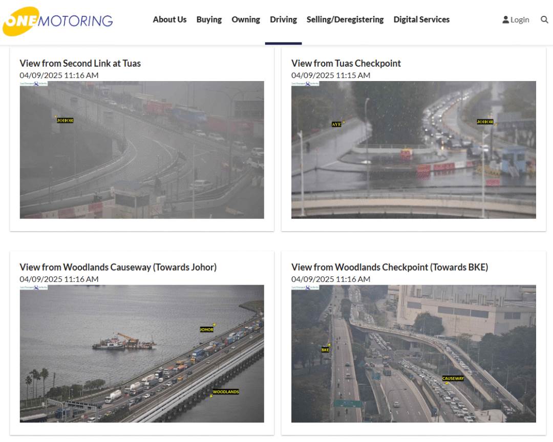 OneMotoring 是 LTA 官方网站,信息可靠,每分钟刷新,有 4 个摄像头实时展示关卡交通,还可查高速实时路况,适合即兴出行,但无流量预测或趋势分析。