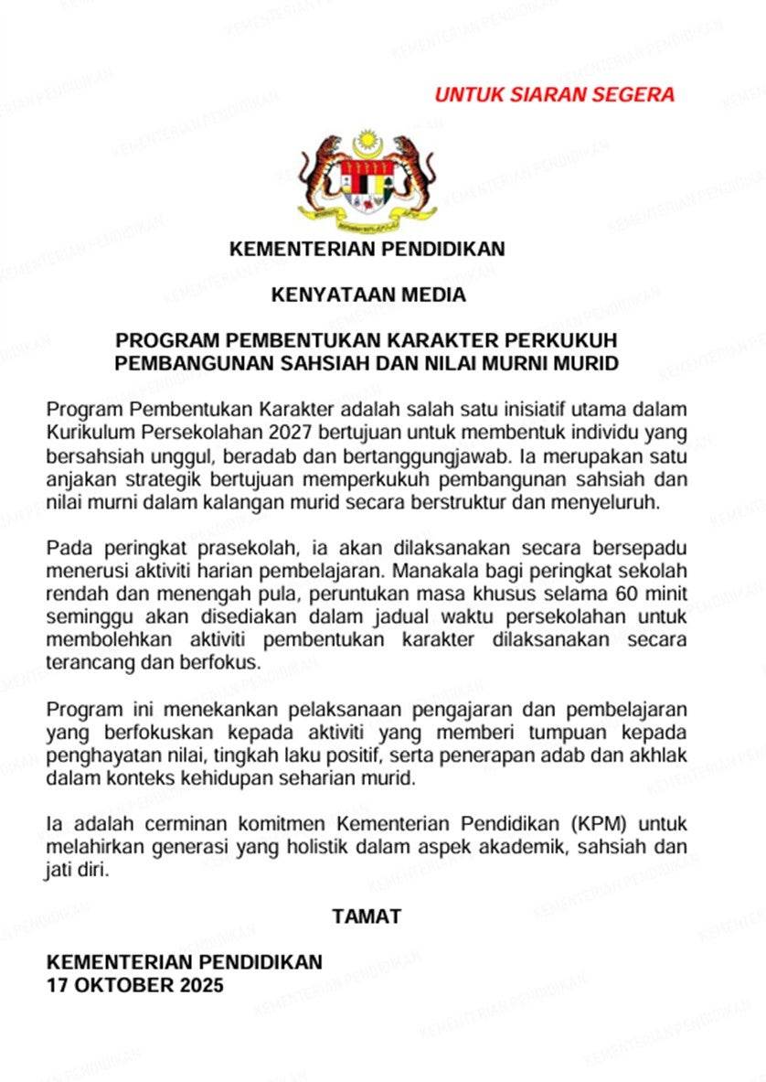 “这项计划是2027年课程改革的重要一步,旨在让学生从小懂礼、有责任感,并且在行为与态度上更成熟。”