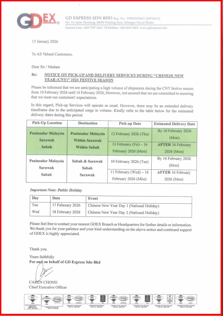 Malaysia 各大快递公司,农历新年前【最后邮寄日期】一次看!