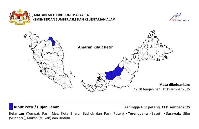 马来西亚气象局发布雷暴警告 (AMARAN RIBUT PETIR),预计以下地区将出现雷暴、豪雨和强风,直至 2025 年 12 月 11 日(星期四)下午 4:00。