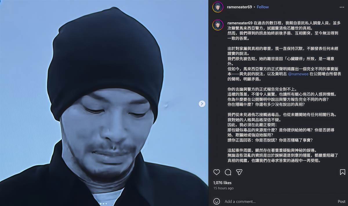 谢侑芯经纪人稍早发出声明,他表示为厘清真相,不仅委托私人调查,更多次联系马来西亚警方,然而得到的讯息却始终矛盾不一,让家属及团队陷入极度困惑与无助,更严肃质问黄明志:“那包疑似违禁品的来源是什么?是你提供给她的吗?你是否诱导她、欺骗她或强迫她服用?”