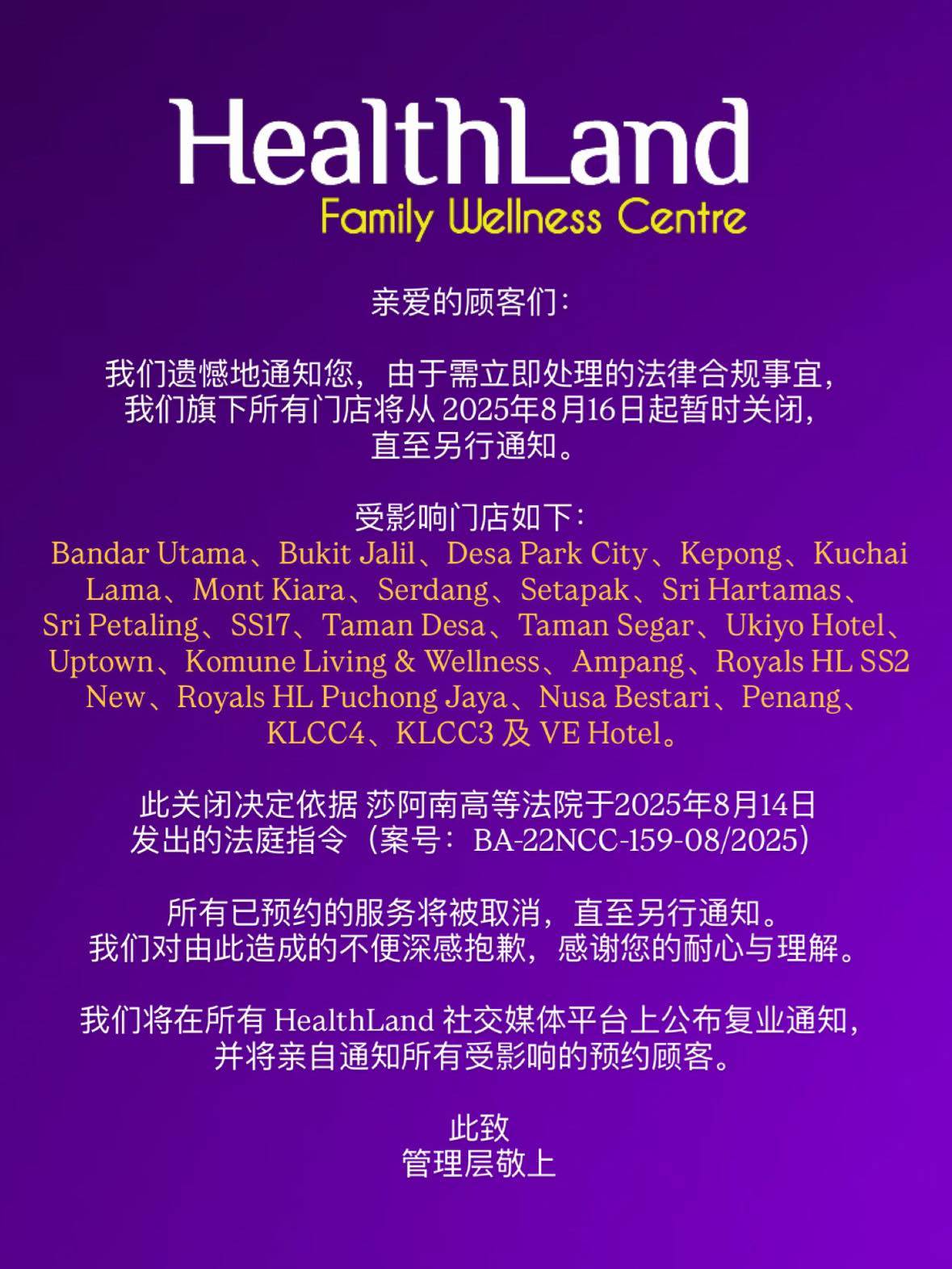同时,HealthLand 表示,所有已预约的服务将被取消,直至另行通知,并对由此造成的不便致歉。公司承诺,将在官方社交媒体平台公布复业通知,并亲自通知受影响的预约顾客。