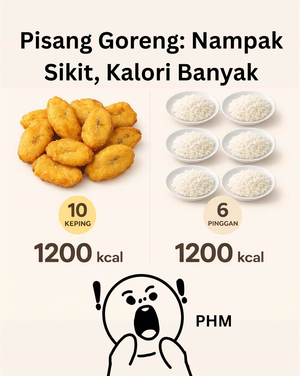 大马公共卫生(Public Health Malaysia)发文提醒,炸香蕉(Pisang Goreng)经常是大马人下午茶的经典选择。然而这看似小小一份的零食,10 片炸香蕉的热量高达 1200 千卡,竟相当于 6 碗白饭,让不少网民直呼 “完全没想到”。