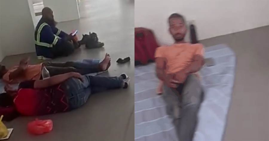 画面中,几名外籍客工正安静地坐在组屋楼下地面的垫子上,有人坐着,有人躺着,看起来只是短暂歇息。