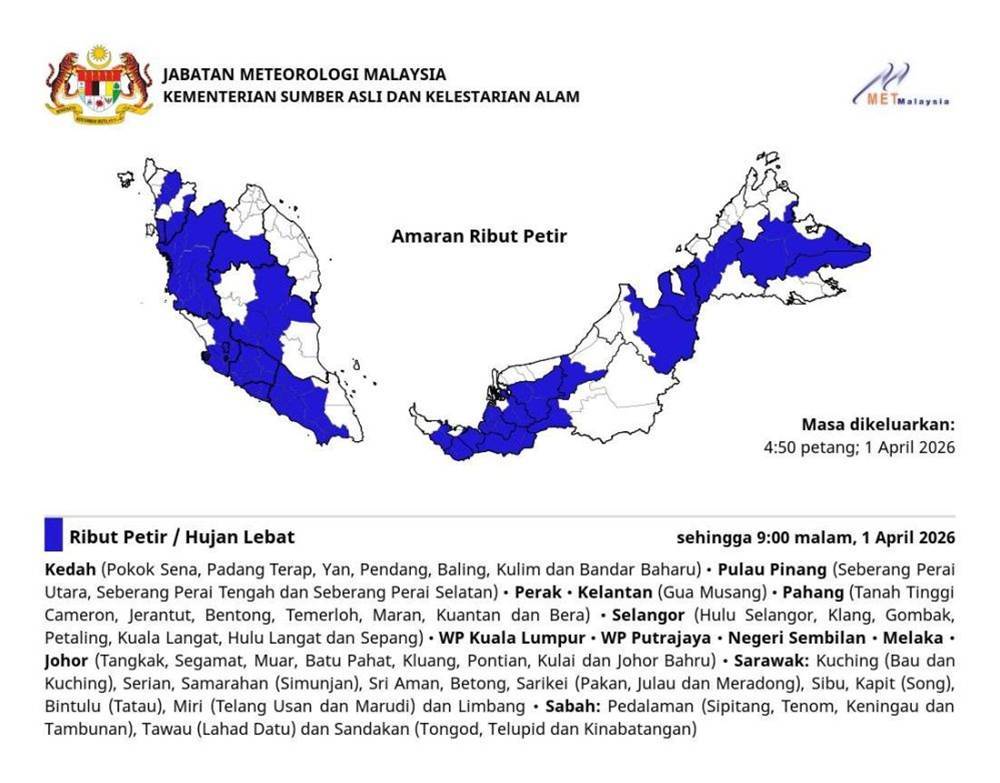 气象部门于2026年4月1日下午4时50分发布警告,预计马来西亚多州将受到雷暴、强降雨和大风影响,警告将持续至当晚9时。
