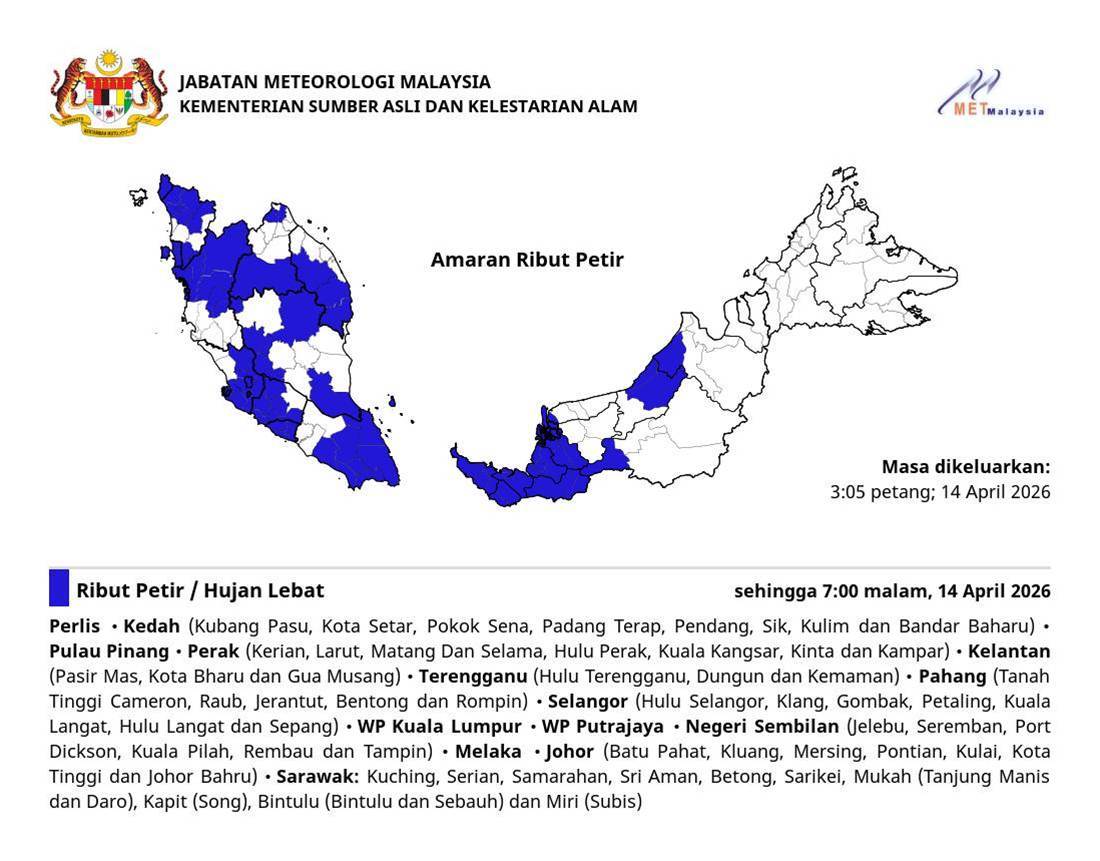 注意!大马气象局于 4 月 14 日下午 3 点 05 分发布雷雨警报,列出 14 州属和直辖区将狂风暴雨至 7PM!